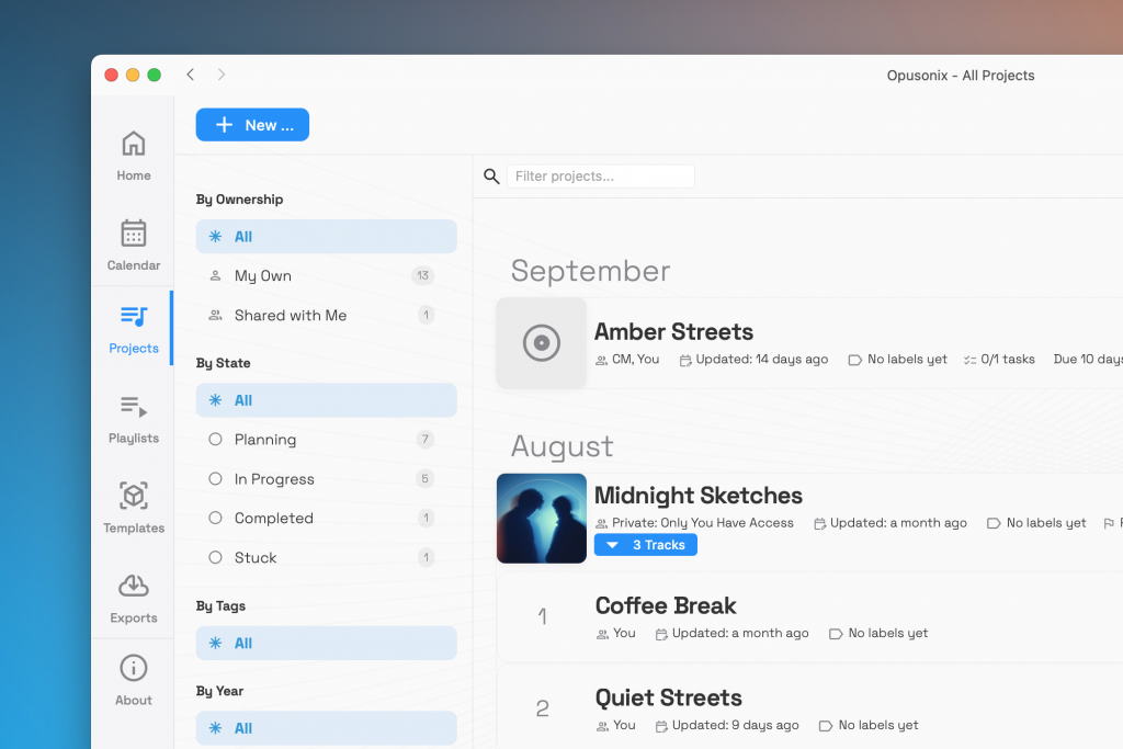 Your projects just got a major upgrade. The new Projects view shows both your track projects and album projects in one place. To make browsing effortless, projects are neatly separated by months—so you can see what you’ve been working on at a glance and quickly pick up where you left off.