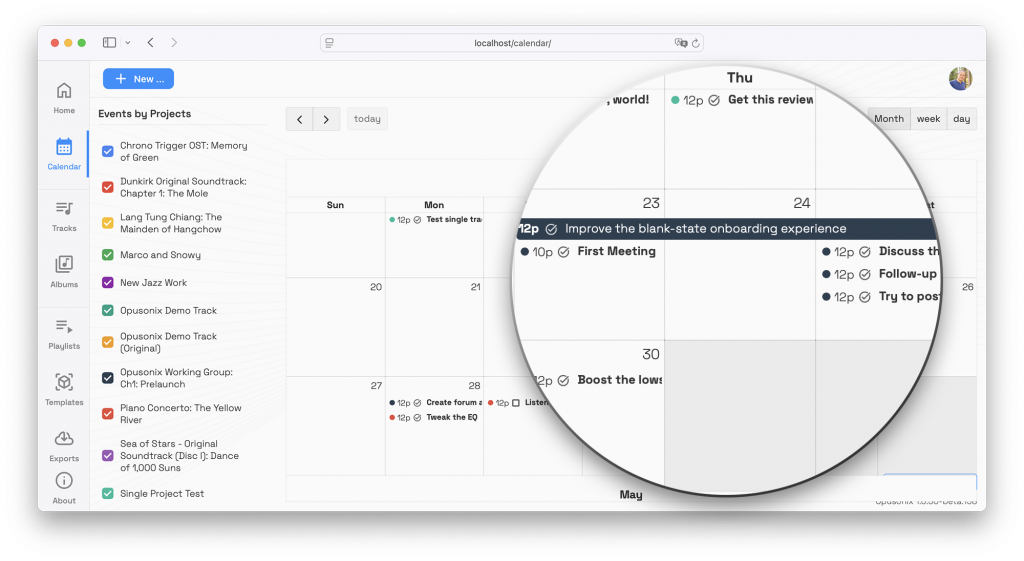 When tasks are tracked in the Tasks pod, your Opusonix dashboard shows progress bars for each project. You can quickly see where projects stand without opening them individually. Plus, all deadlines and pending tasks automatically appear in your Calendar view, giving you a comprehensive overview of upcoming actions across all your track projects.