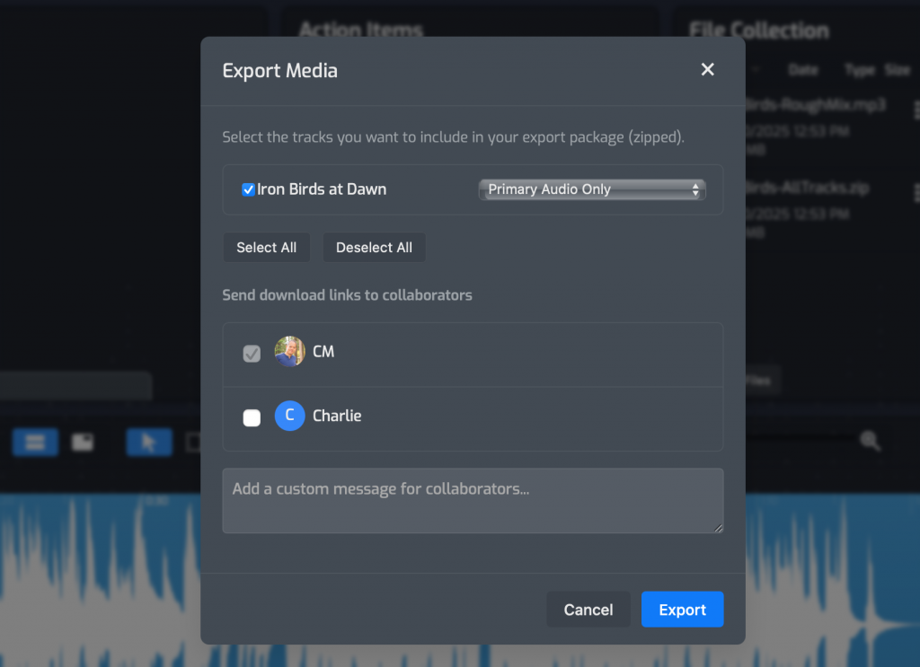 When it’s time to deliver the final product, the Export feature in the Share panel makes it simple. You can export one or multiple Primary Tracks in full resolution as a single zipped file, and you can select which recipients — including your clients — receive an email with the download link. You, as the engineer, always get a copy of the email. This eliminates the need to manually send files, track downloads, or manage housekeeping tasks at the end of the project.