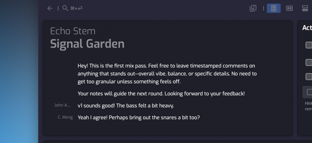 For engineers and producers, this means less time spent hunting for files, chasing feedback, or managing emails — freeing you to focus on creativity and making better mix decisions. For clients, it translates into clear communication, transparent progress tracking, and a professional, stress-free experience.