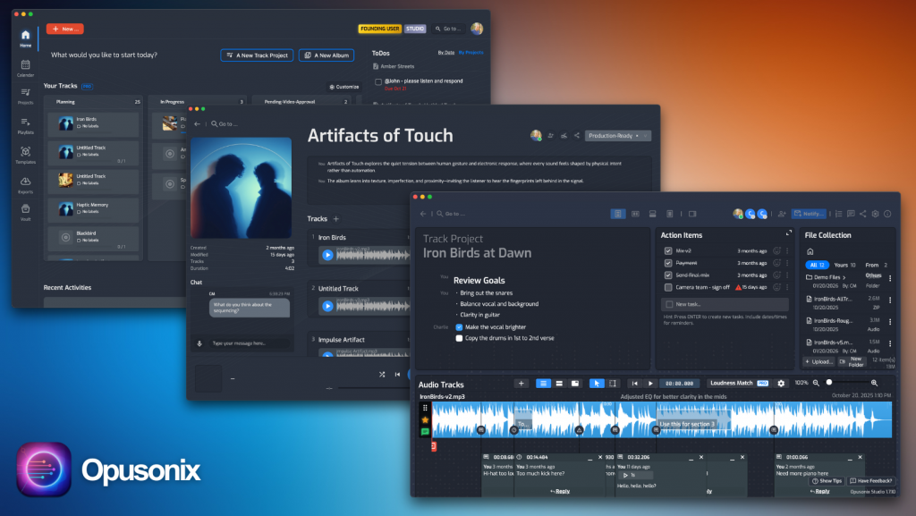 Opusonix approaches music production collaboration as a system-level problem. File exchange, timestamped feedback, mix comparison, communication, delivery, and project management are designed to work together within a single workspace. Collaboration is not an add-on, but the core organizing principle.