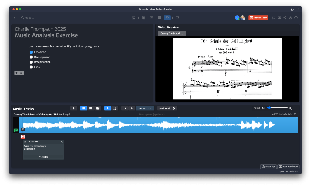 Instructors can embed video resources and conduct live critique sessions with timestamped notes. Students can compose to picture, compare cue versions, and receive contextual feedback — all inside one environment.